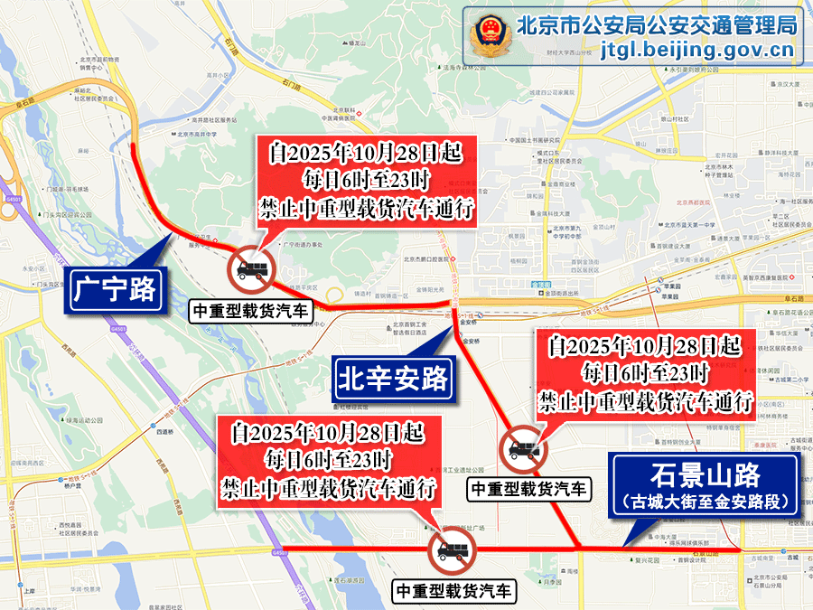 为保证石景山区首钢园周边地区交通安全有序,根据道路交通安全法律法规有关规定,决定自2025年10月28日起,石景山区石景山路(古城大街至金安路段)、北辛安路、广宁路,每日6时至23时禁止中重型载货汽车通行。