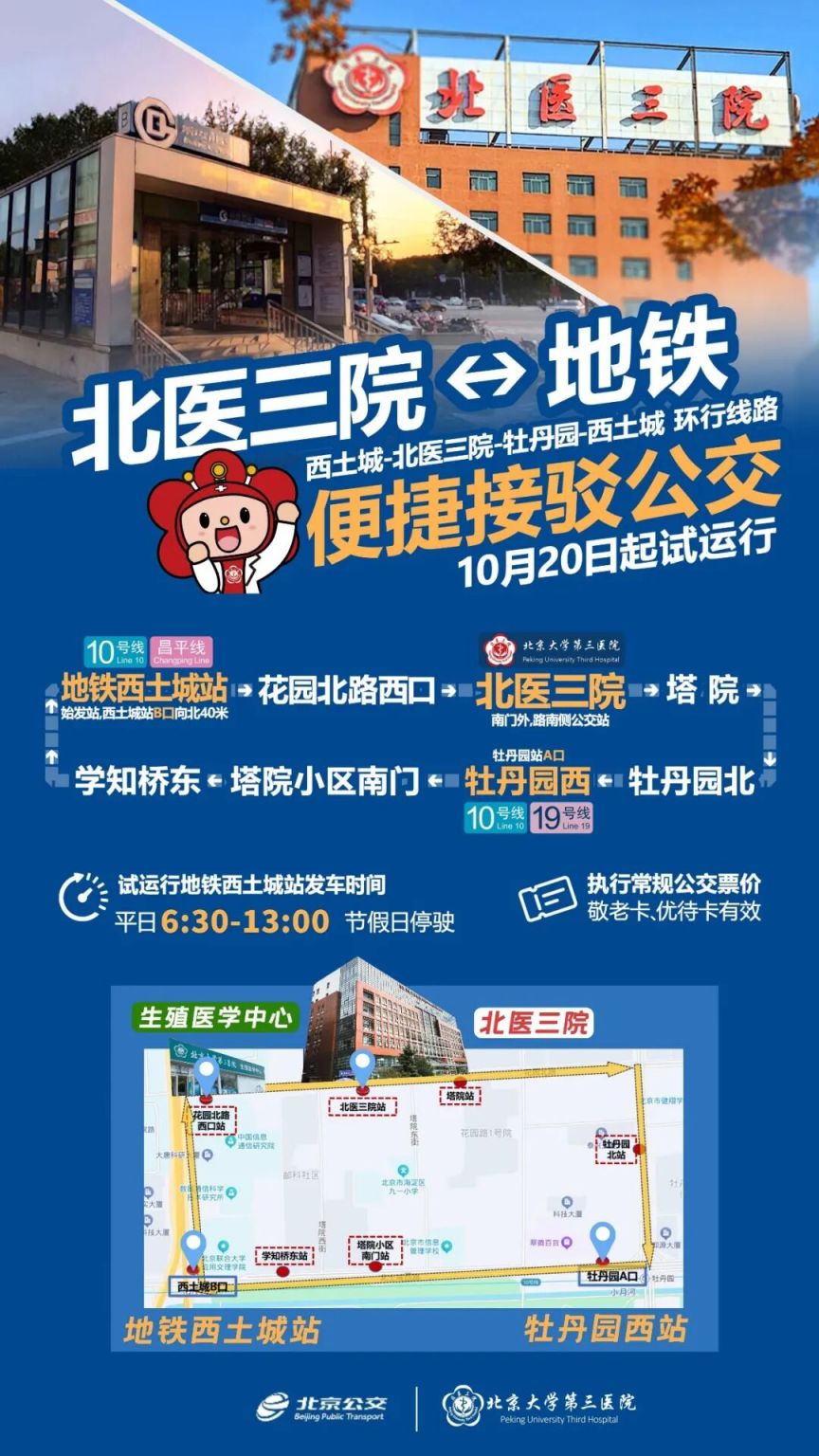 [地铁西土城站B口](北侧约40米新设公交专线站牌)和[地铁牡丹园站A口],经由沿途公交站点,乘坐该公交专线可抵达[北医三院生殖中心]和[本部院区]。欢迎广大就医患者选乘公共交通,绿色出行。