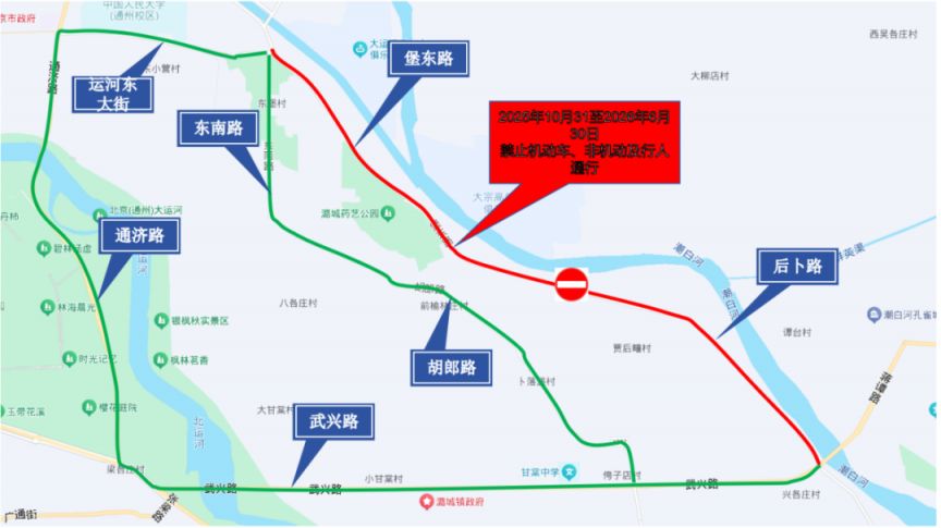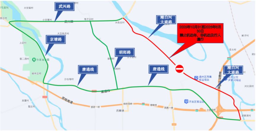 为配合实施潮白河综合治理与生态修复工程(通州段),提升城市防洪安全水平,保证施工期间的道路交通安全,自2025年10月31日20时00分起至2026年6月30日24时00分止,对潮白河右堤路(京榆旧线—唐通线)道路进行分段封控。