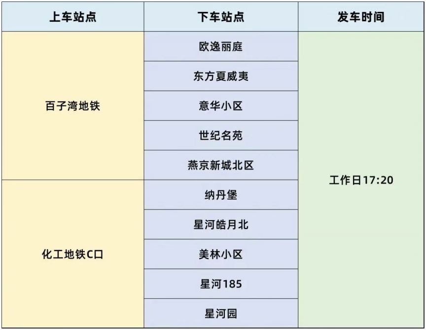 03 出京线路。发车时间为工作日17:20。设置上车站点2个,下车站点10个。站点如下: