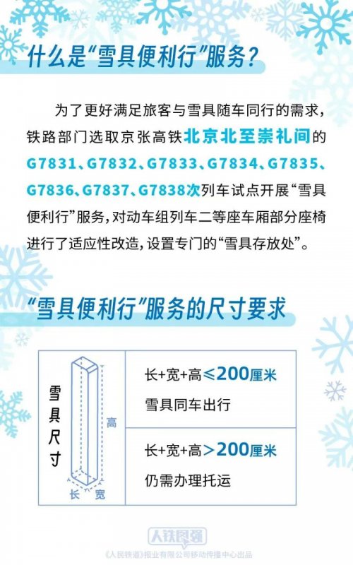 为了更好满足旅客与雪具随车同行的需求,铁路部门统筹考虑旅客安全、乘车秩序和雪具运输需求,选取京张高铁北京北至崇礼间的G7831、G7832、G7833、G7834、G7835、G7836、G7837、G7838次列车试点开展“雪具便利行”服务,对动车组列车二等座车厢部分座椅进行了适应性改造,设置专门的“雪具存放处”,旅客选择该服务后可携带长、宽、高之和不超过200厘米的雪具同车出行,滑雪更加方便快捷。对于长、宽、高之和超过200厘米的雪具,由于高铁列车车内空间限制,仍需办理托运。