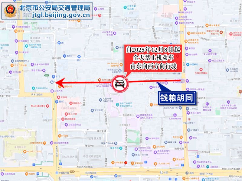 为保证东城区钱粮胡同交通安全顺畅,根据道路交通安全法律法规有关规定,决定自2025年12月8日起,钱粮胡同由“7时至22时”禁止机动车由东向西方向行驶,调整为全天禁止机动车由东向西方向行驶。