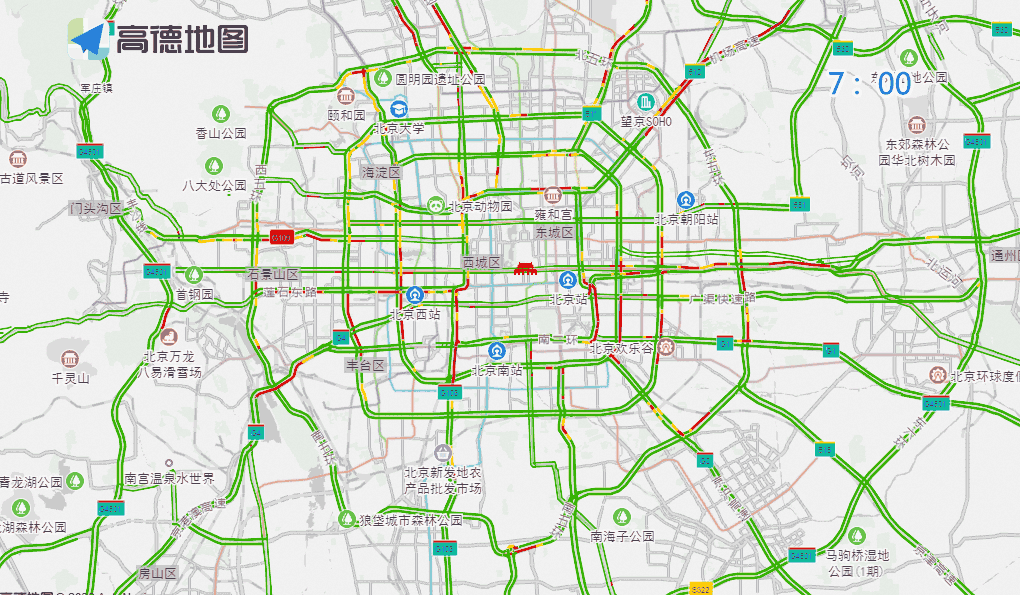 冬季早晚高峰自驾车通勤较多,城区环路、联络线等主要道路通行压力较大。早高峰期间,城区环路部分路段,以及菜户营南路、通惠河北路、西直门北大街、德胜门外大街、圆明园西路至万泉河路、阜石路、莲石东路、京通快速等道路进城方向,以及京藏高速、京承高速、京港澳高速、机场高速等高速公路进京方向车流量较大,高峰时段为7:00—9:00,周一、周二早高峰通行压力将尤为突出。