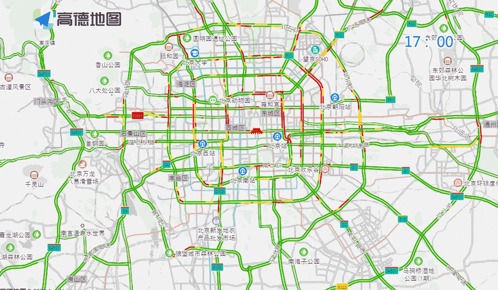 晚高峰期间,城区环路、东六环部分路段,以及万泉河路至圆明园西路、通惠河北路、京通快速、莲石东路等道路出城方向车流集中,京藏高速、京承高速、京港澳高速、机场高速等高速公路出京方向车流量大,高峰时段为17:30—20:00,周二、周五晚高峰通行压力将尤为突出。