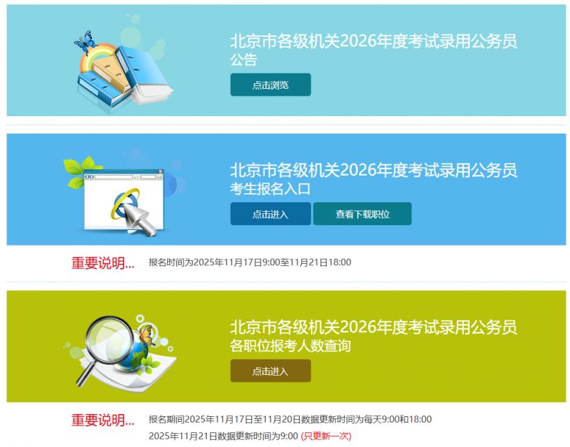 北京市人事考试通用平台官网入口 https://rsj.beijing.gov.cn/bm/ztzl/gwy/ 考试安排 日期 事项 2025年11月17日9:00-11月21日18:00 提交报考申请 2025年11月17日-11月22日 查询资…