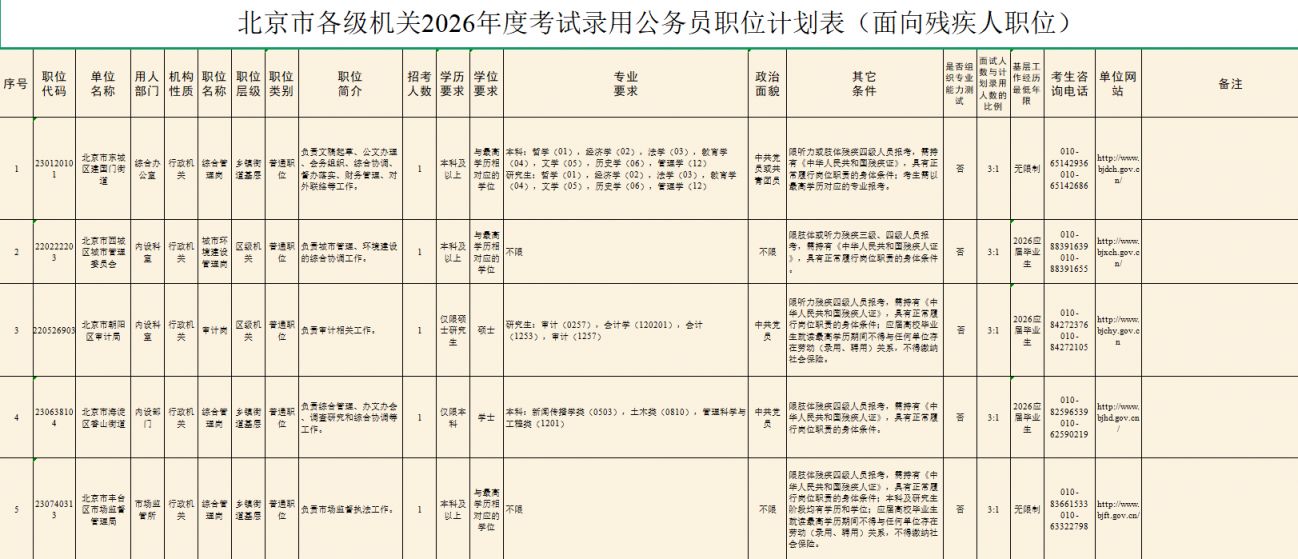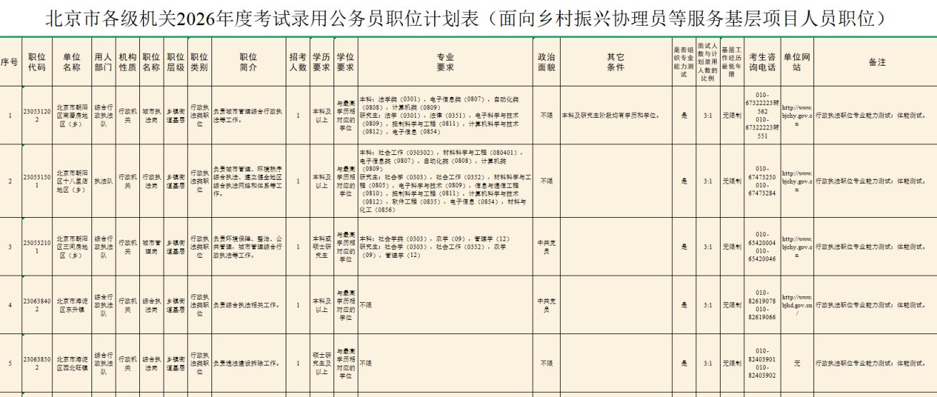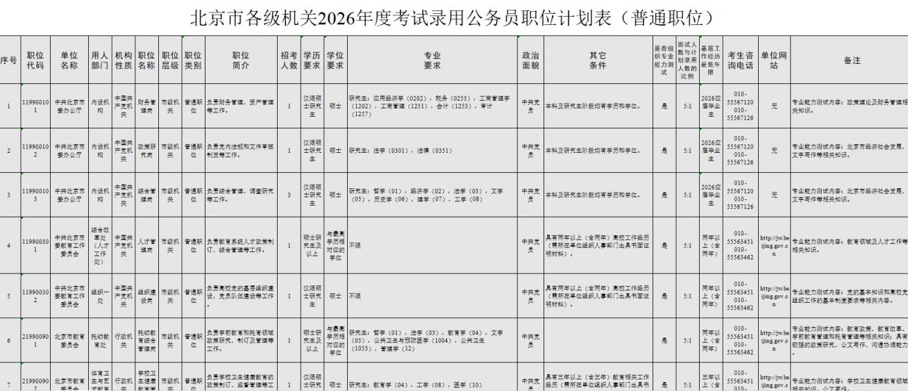 2026北京市公务员考试岗位表公布 免下载可筛选版职位表:点击查看 职位表下载:北京市各级机关2026年度考试录用公务员招考简章 各招录机关的招考人数、具体职位、资格条件等详见《北京市各级机关2026年度考试录用公务员招考简章》(以下简称《招考…