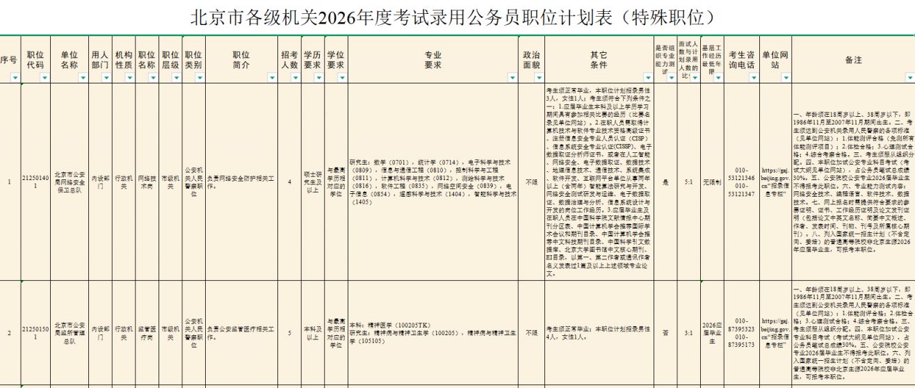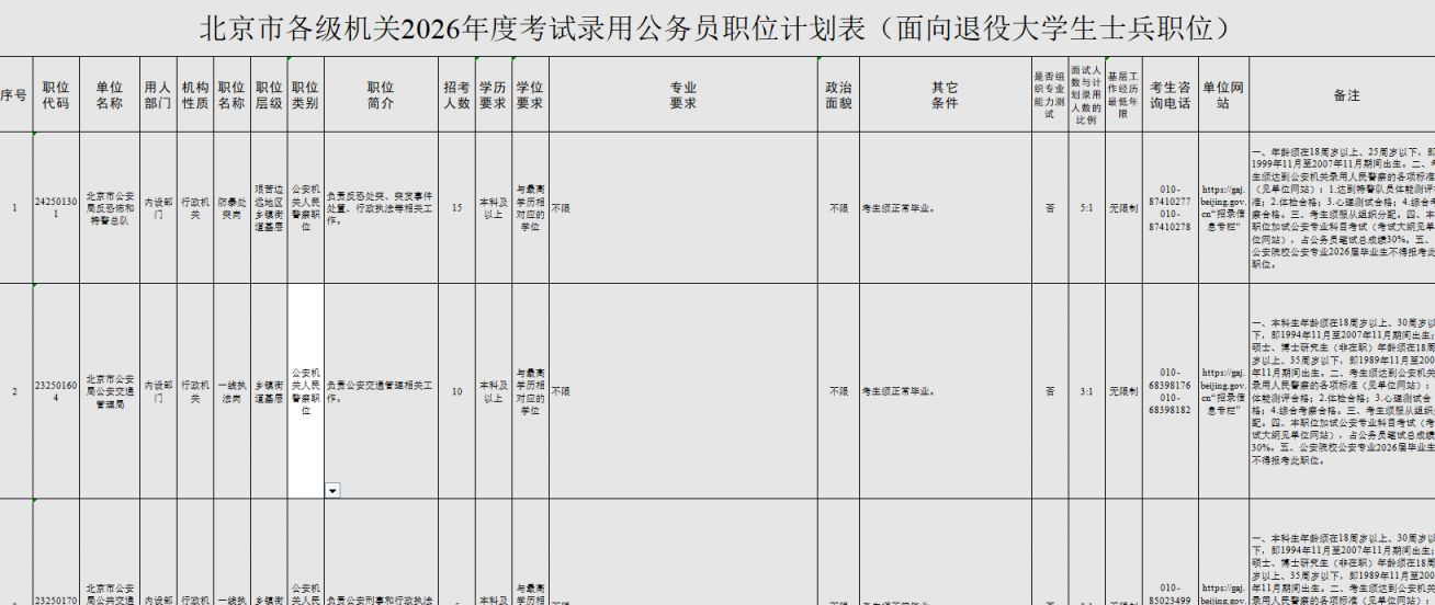 职位表下载入口:北京市各级机关2026年度考试录用公务员招考简章