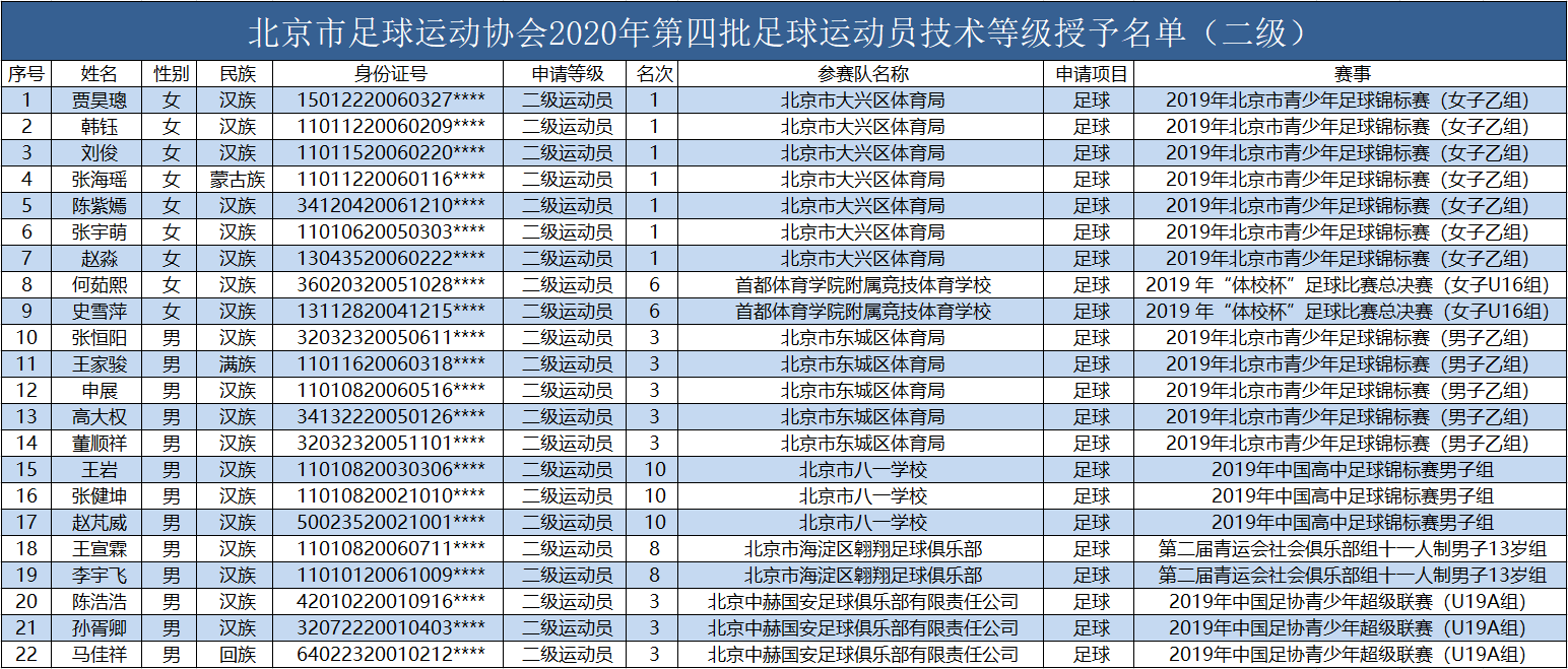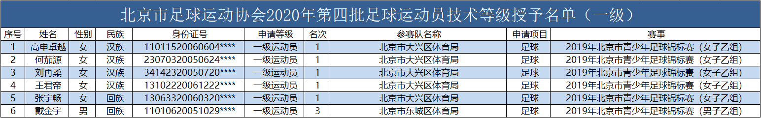 根据《中国足球协会足球运动员技术等级管理办法(2019版)》《中国足球协会足球运动员技术等级标准(2019版)》文件要求,我协会于2020年7月8-15日对第四批拟授予一级运动员、二级运动员称号的高申卓越等28人(名单见附件)进行了公示,且公示期内无任何异议。现授予高申卓越等28人一级运动员、二级运动员称号。