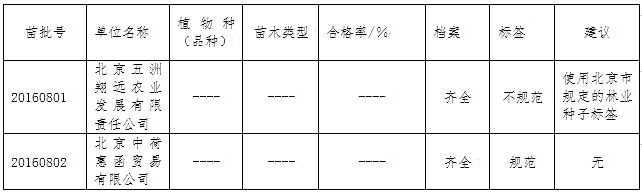 执法人员在北京五洲翔远农业发展有限责任公司、北京中荷惠函贸易有限公司询问了负责人生产经营情况,两公司均无在销苗木,只检查了近三年的档案,包括:林木种子生产经营档案表、苗木标准、购销合同、检疫证书、自检情况和标签等。抽查结果如下: