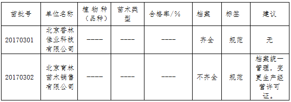 执法人员在被抽查企业现场询问了负责人生产经营情况,查看了生产经营场所,按规定检查了企业近三年的档案,包括:林木种子生产经营档案表、苗木标准、购销合同、检疫证书、自检情况和标签等。抽查结果如下: