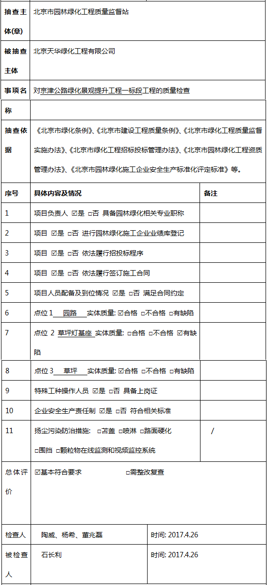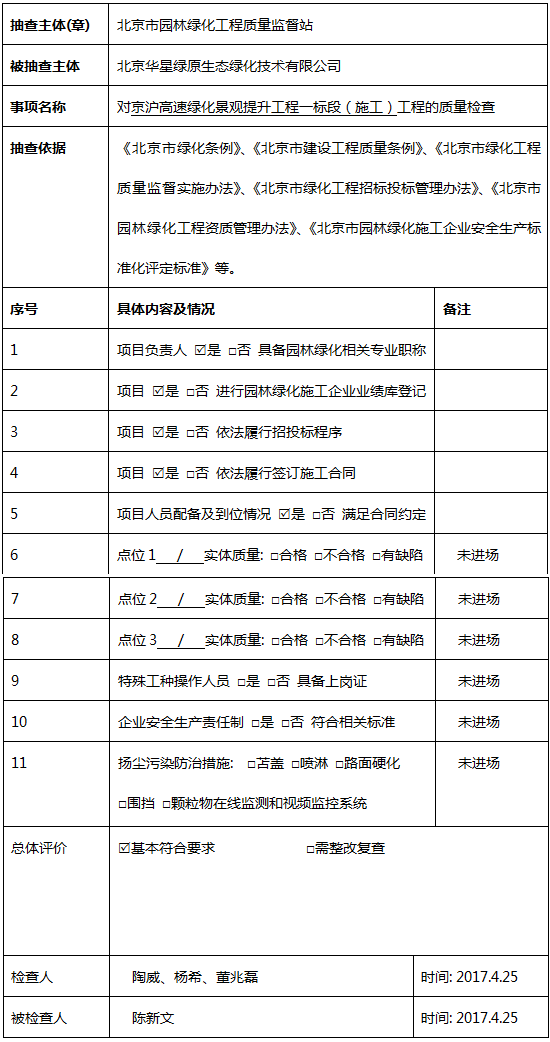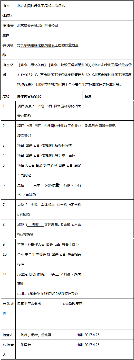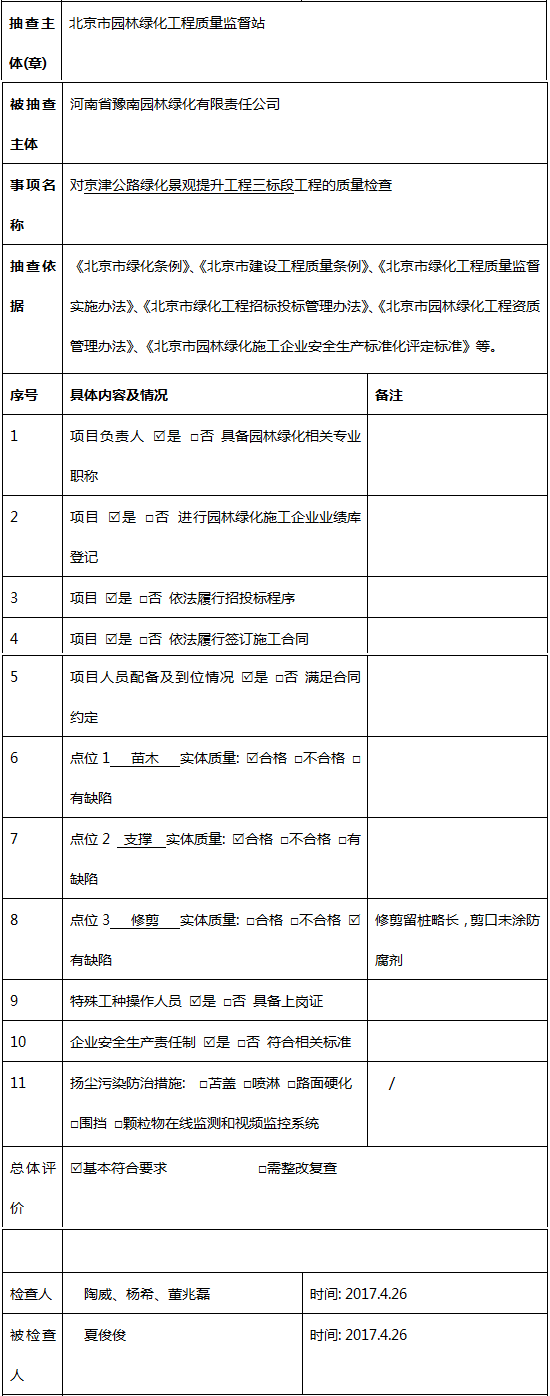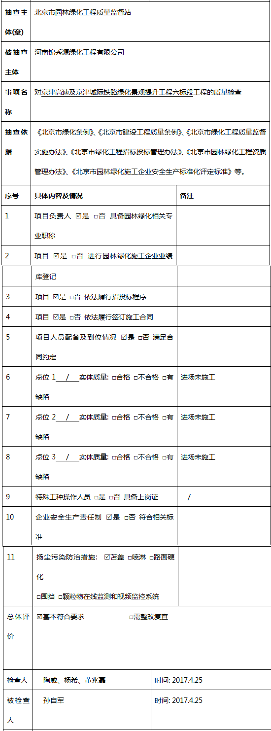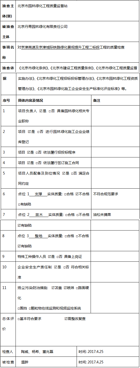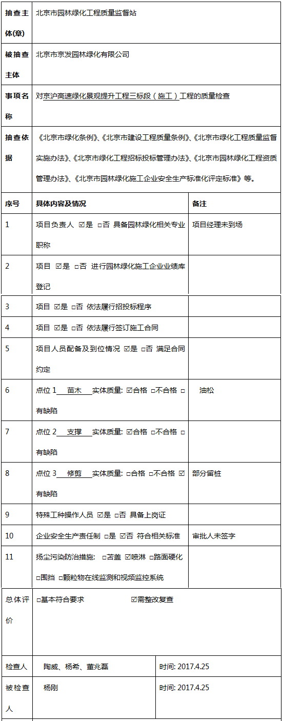 执法人员依法检查了随机抽取的7个项目。现场询问了项目负责人在施项目的基本概况。从企业管理、招投标、现场工程实体质量及安全和文明施工、扬尘污染防治措施等方面核验了被抽查主体,并对检查结果进行了现场签字确认。本着促进施工质量的目的,针对工程实体质量存在的支撑不符合规范要求、修剪存在缺陷,以及安全生产责任制落实不到位等问题,对京沪高速绿化景观提升工程三标段、京津高速及京津城际铁路绿化景观提升工程二标段的两家施工单位分别开具了“整改通知书”,限期整改。