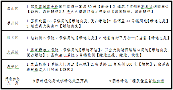为贯彻落实国务院办公厅《关于推广随机抽查规范事中事后监管的通知》相关精神,2017年8月7日至11日,北京市园林绿化局按照“双随机一公开”监管模式要求,组织对城市发展新区的绿化资源管理保护情况实施了双随机抽查。现将抽查结果公示如下:
