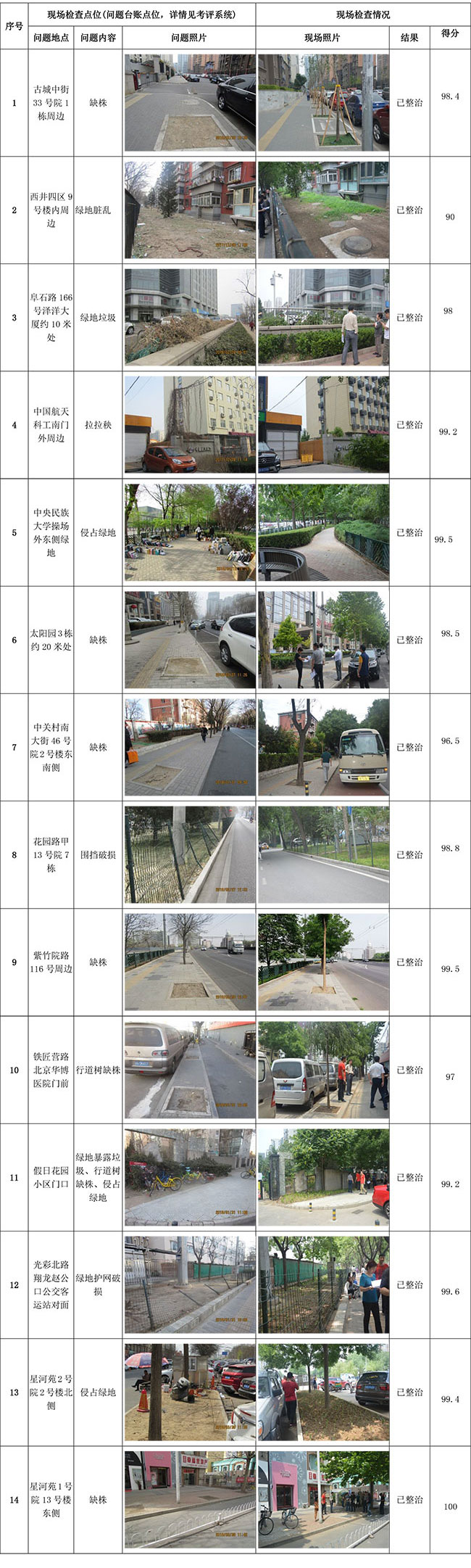 1. 中央民族大学操场外东侧绿地【侵占绿地】;2. 太阳园3栋约20米处【缺株】;3. 中关村南大街46号院2号楼东南侧木【缺株】;4. 花园路甲13号院7栋【围挡破损】;5. 紫竹院路116号周边【缺株】 |