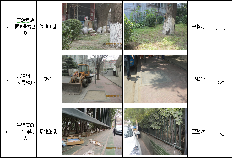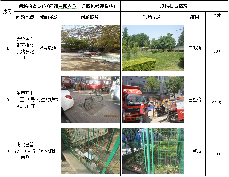 1. 天桥南大街天桥公交站东北侧【侵占绿地】;2. 景泰西里西区15号楼105门前【行道树缺株】;3. 南弓匠营胡同1号楼南侧【绿地脏乱】;4. 南颂年胡同5号楼西侧【绿地脏乱】;5. 先晓胡同10号楼外【缺株】 |