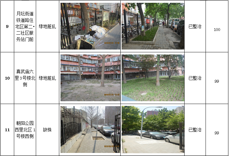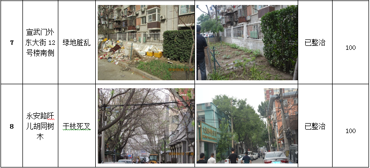 1. 半壁店街44栋周边【绿地脏乱】;2. 宣武门外东大街12号楼南侧【绿地脏乱】;3. 永安路阡儿胡同树木【干枝死叉】;4. 月坛街道铁道路住宅区第二•二社区服务站门前【绿地脏乱】;5. 真武庙六里3号楼北侧【绿地脏乱】 |