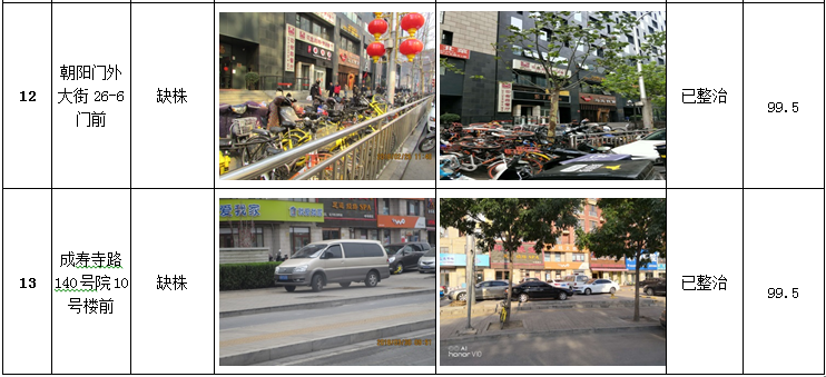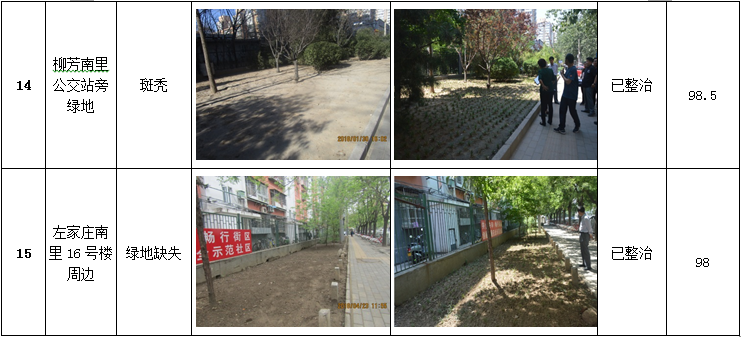 1. 朝阳公园西里北区1号楼西侧【缺株】;2. 朝阳门外大街26-6门前【缺株】;3. 成寿寺路140号院10号楼前【缺株】;4. 柳芳南里公交站旁绿地【斑秃】;5. 左家庄南里16号楼周边【绿地缺失】 |