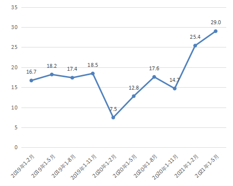 2021年1-5月,全市大中型重点企业研究开发费用合计[1]1147.9亿元,同比增长29% ;期末有效发明专利14.2万件,同比增长22.9%。