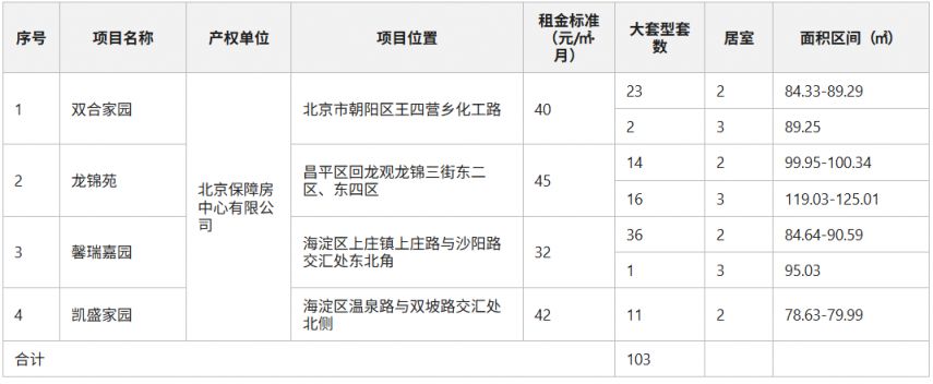 此次配租的公共租赁住房均由北京保障房中心有限公司持有运营,房源共计103套,均为大套型。具体情况如下: