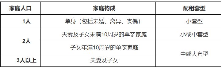 登记家庭应在保障性住房备案资格规定的配租套型标准内选择唯一套型(如小套型、中套型、大套型)进行意向登记。保障性住房规定的配租套型标准为: